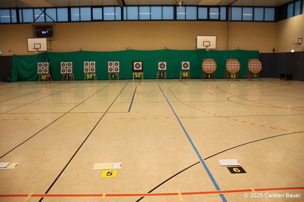 In der Grundschulsporthalle standen 10 Scheiben, bestückt mit verschieden große Auflagen. Auch drei 60-cm-Auflagen waren dabei, u. a. für unsere Neuen. Zum Vergleich: beim Wendland Cup können wir maximal 21 Scheiben in der Halle unterbringen.