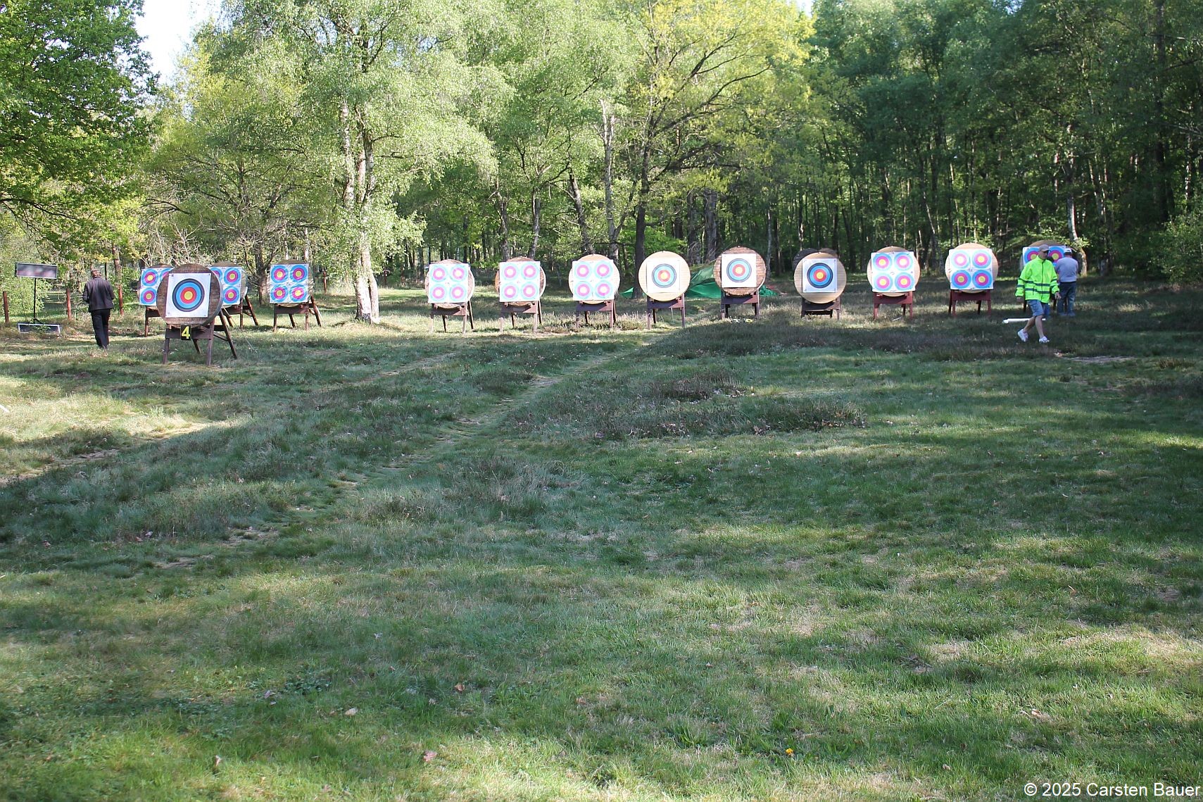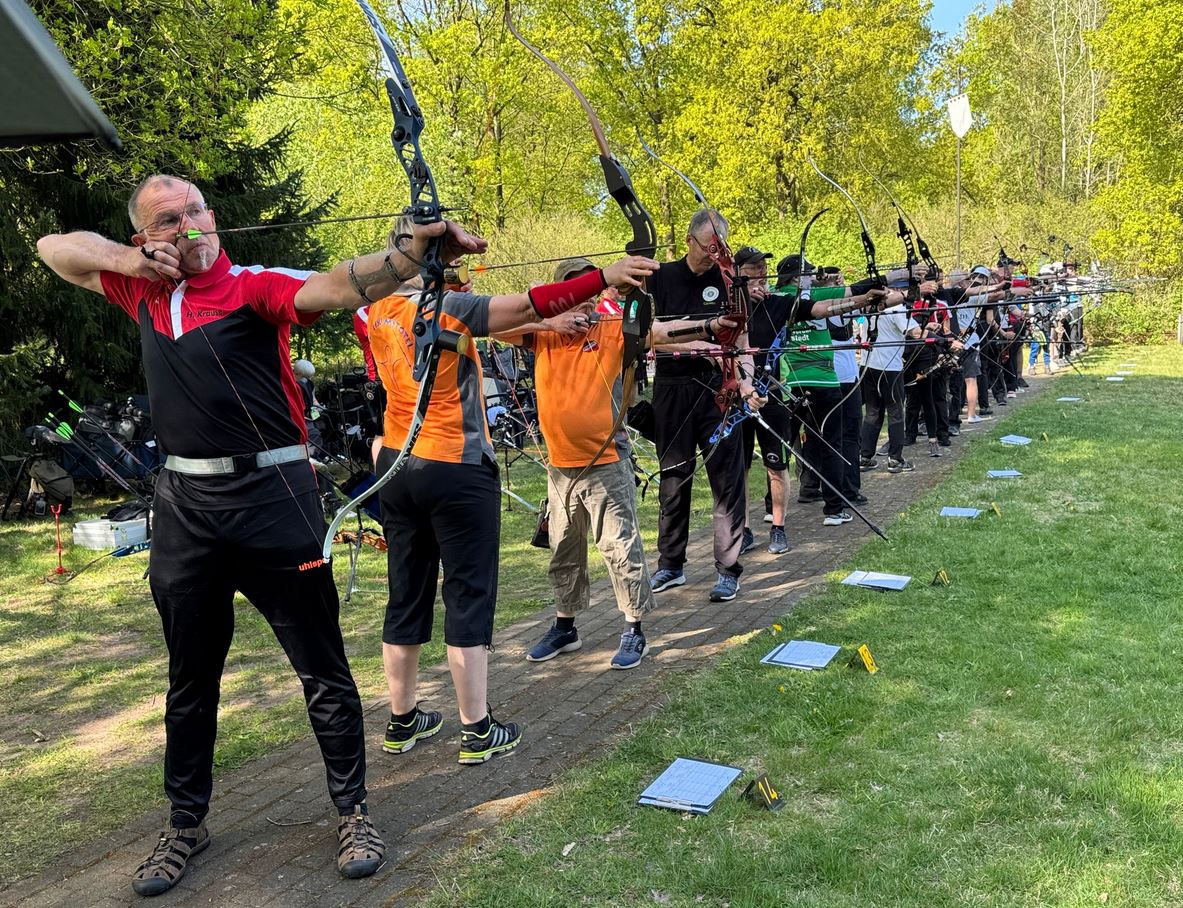 Es war ein Sommertag wie er im Buche steht: am 1. Mai 2025 strahlte die Sonne vom wolkenlosen Himmel und ließ das Gold auf den Scheiben nur so leuchten. Der kleine Bogensportplatz in Achim liegt inmitten eines Parks und statt Rasen ziert inzwischen eine Heidefläche den Platz. Zu den Scheiben kommt man aber bequem auf im wahrsten Sinne des Wortes „ausgetretenen Pfaden“