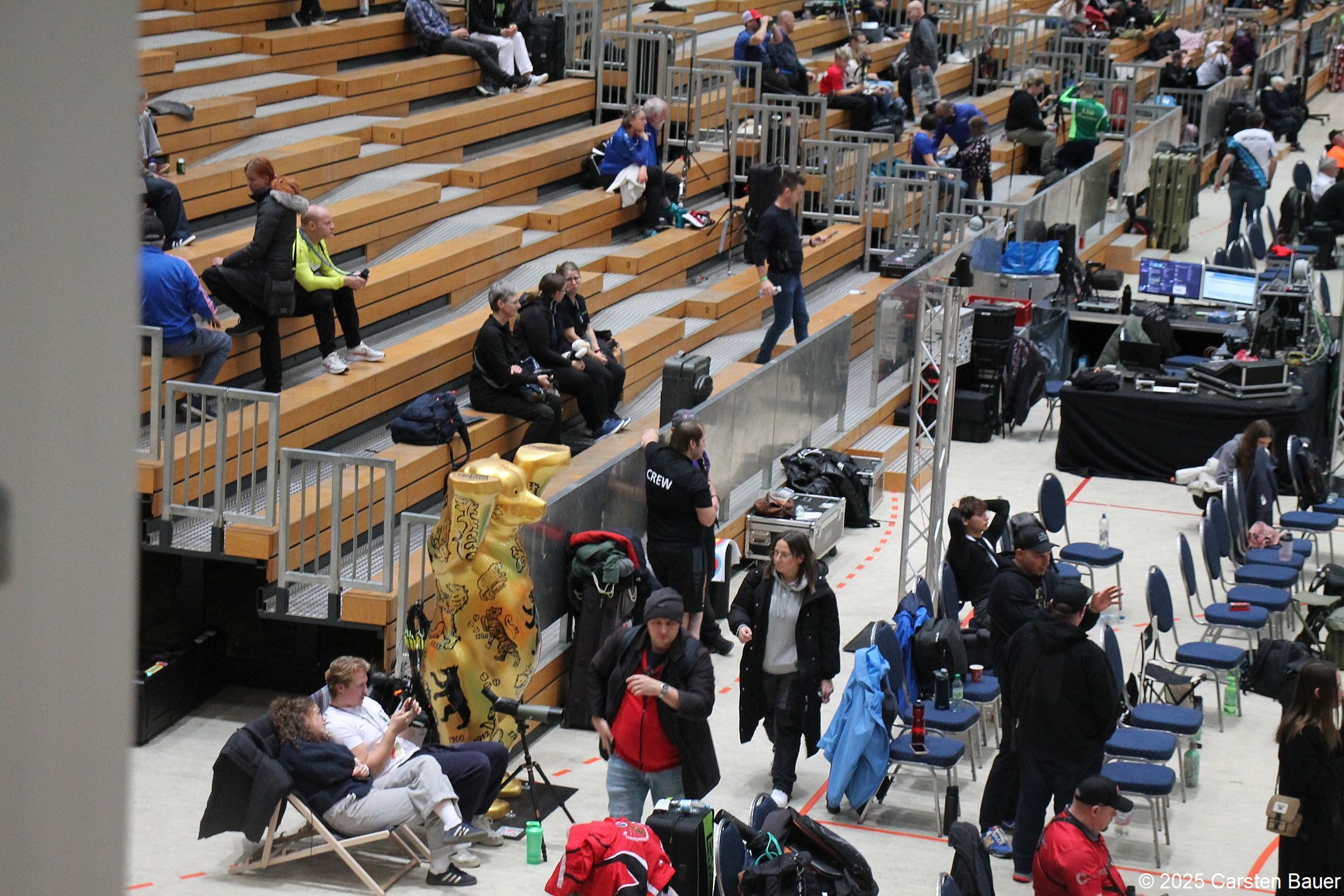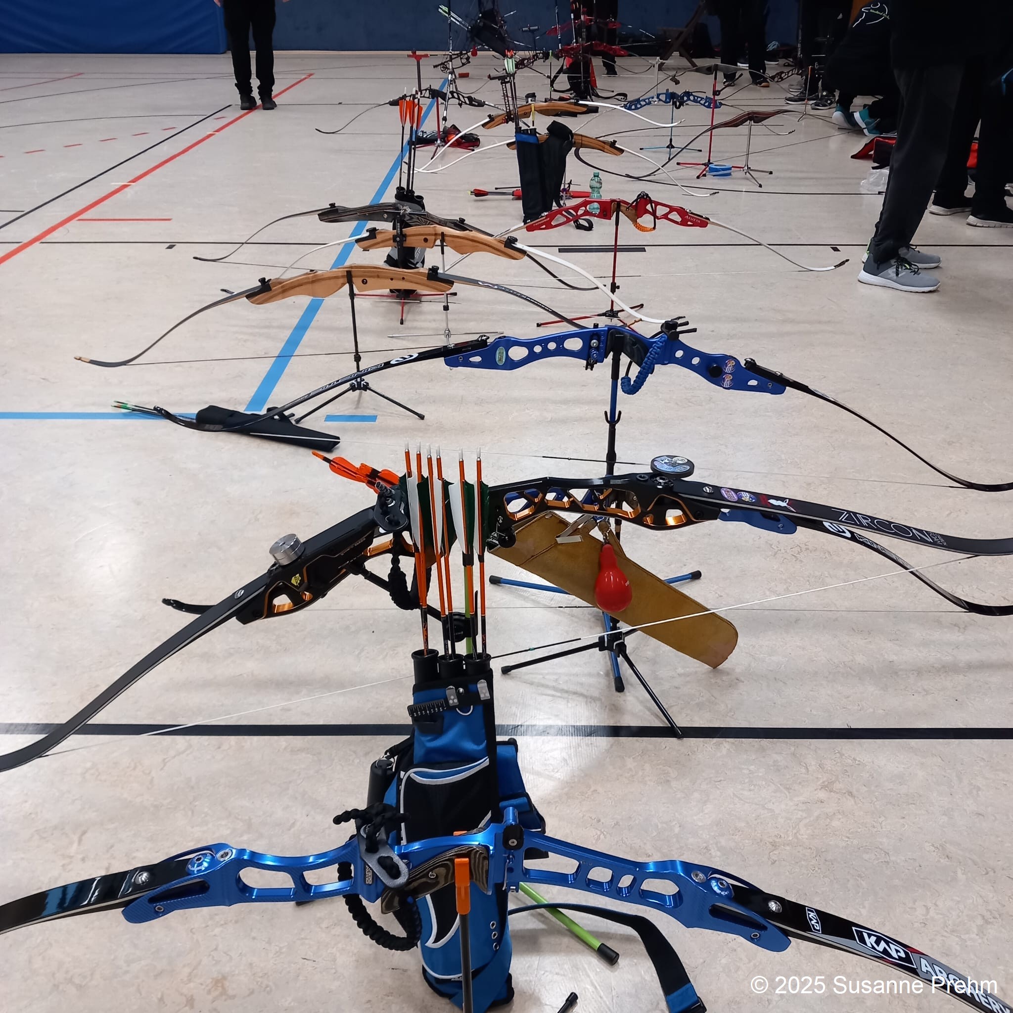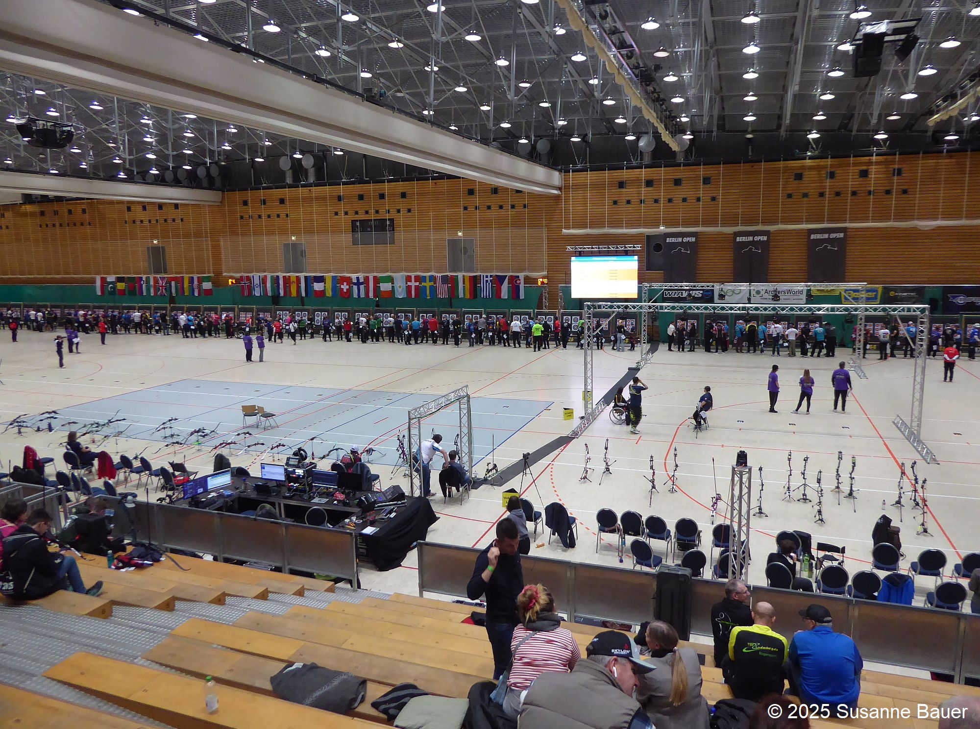 Schon beim Eintreten in die Sporthalle war ein geschäftiges Treiben zu spüren. Verschiedene Händler hatten im Vorraum ihre Stände aufgebaut und boten alles an, was ein Bogensportlerherz höher schlagen lässt. Überall begegnete man Bogensportlern und hörte fremde Sprachen.