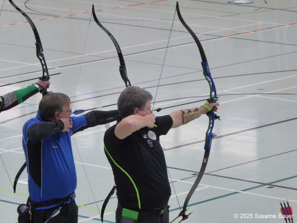 Am Samstag waren wir schon früh in der Halle. Die Startnummer am Köcher befestigen, den Bogen aufbauen, Bogenkontrolle - alles schon Routine. Auch das Aufwärmen gehört dazu.