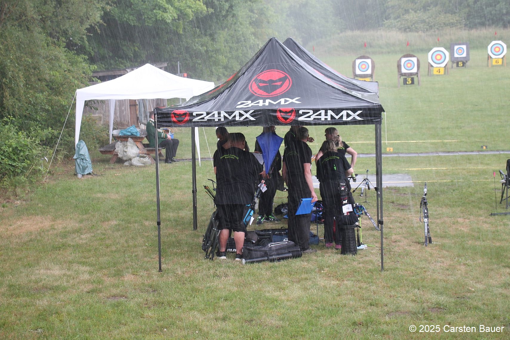 Mit der letzten Wertungspasse kündigte sich dann wieder Regen an. Wir schafften es gerade eben noch, die Treffer aufzunehmen und zurückzugehen, bevor es richtig anfing zu schütten. Einige hatten es noch auf die Terrasse geschafft, andere suchten Schutz unter den Zelten.