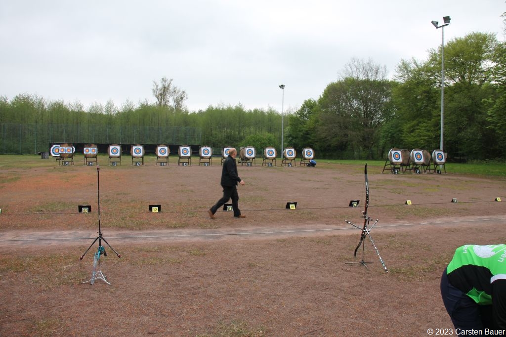 Carsten traf in der Klasse Recurve Master auf 4 weitere Schützen. Nach dem Einschießen startete er mit guten Wertungspassen. Doch dann verrutschten die Nockpunkte auf seiner Sehne. Das kannte er schon vom Training zu Hause. Das Resultat zeigte sich sofort auf der Scheibe. Aber man reist nie ohne Werkzeugkoffer zu anderen Turnieren. Von Ersatzpfeilauflage bis hin zur Nockpunktzange ist immer alles dabei. In diesem Fall half zwischen zwei Passen ganz einfach Sekundenkleber