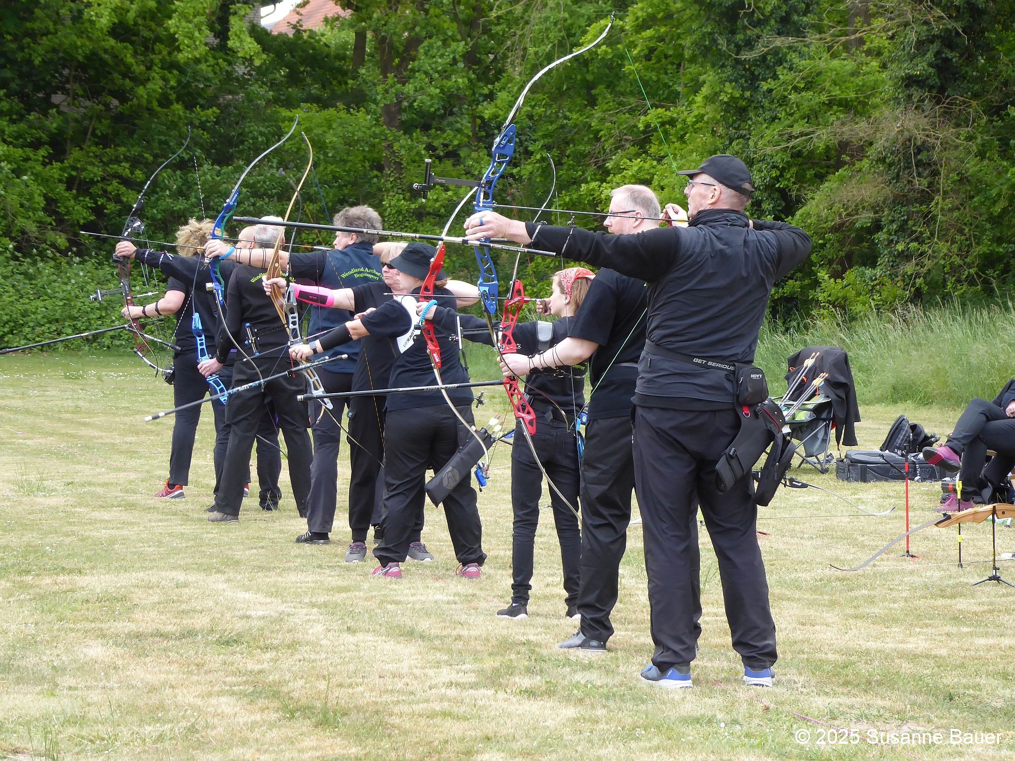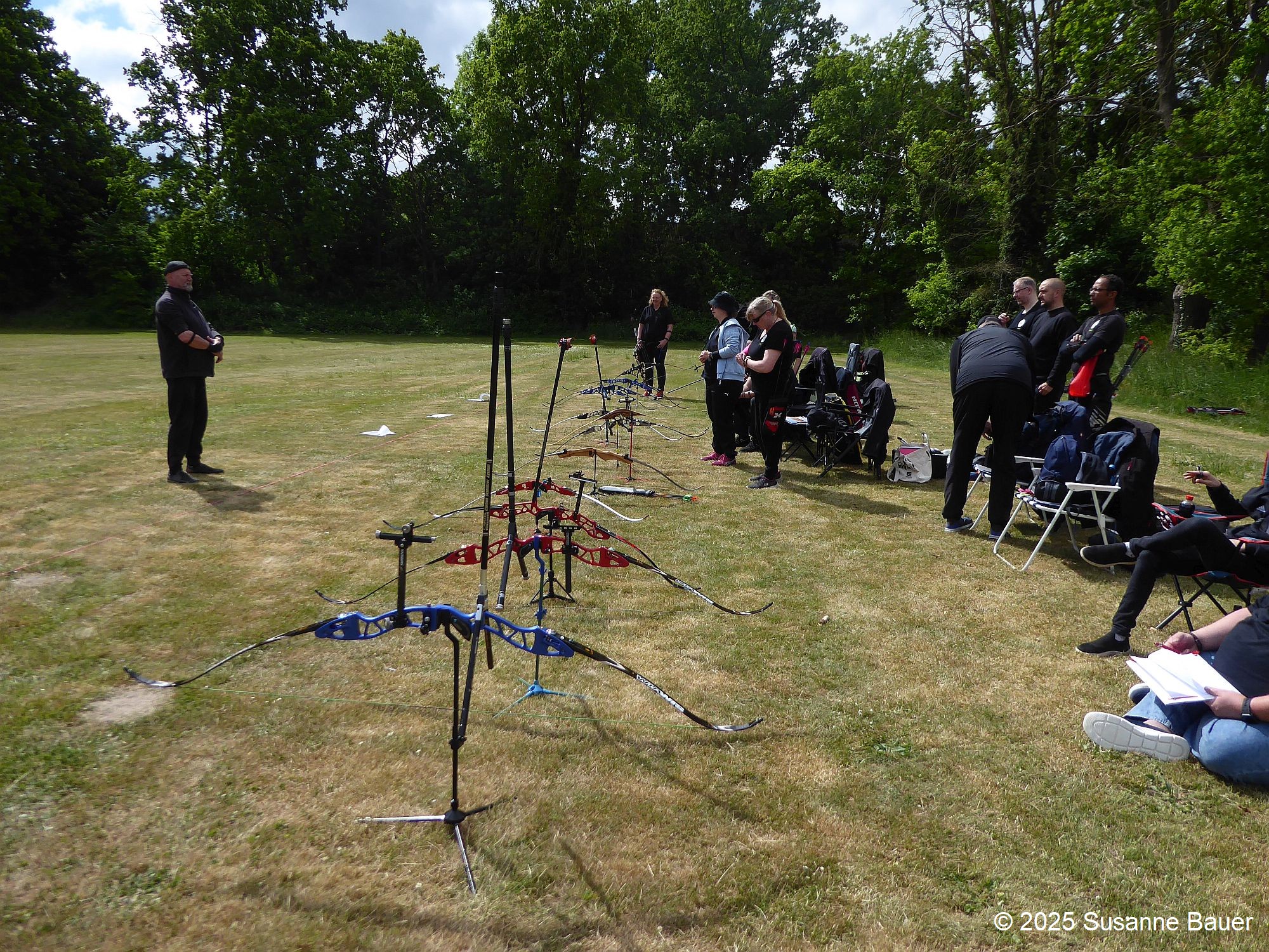 Es war ein Sommertag wie er im Buche steht: am 1. Mai 2025 strahlte die Sonne vom wolkenlosen Himmel und ließ das Gold auf den Scheiben nur so leuchten. Der kleine Bogensportplatz in Achim liegt inmitten eines Parks und statt Rasen ziert inzwischen eine Heidefläche den Platz. Zu den Scheiben kommt man aber bequem auf im wahrsten Sinne des Wortes „ausgetretenen Pfaden“