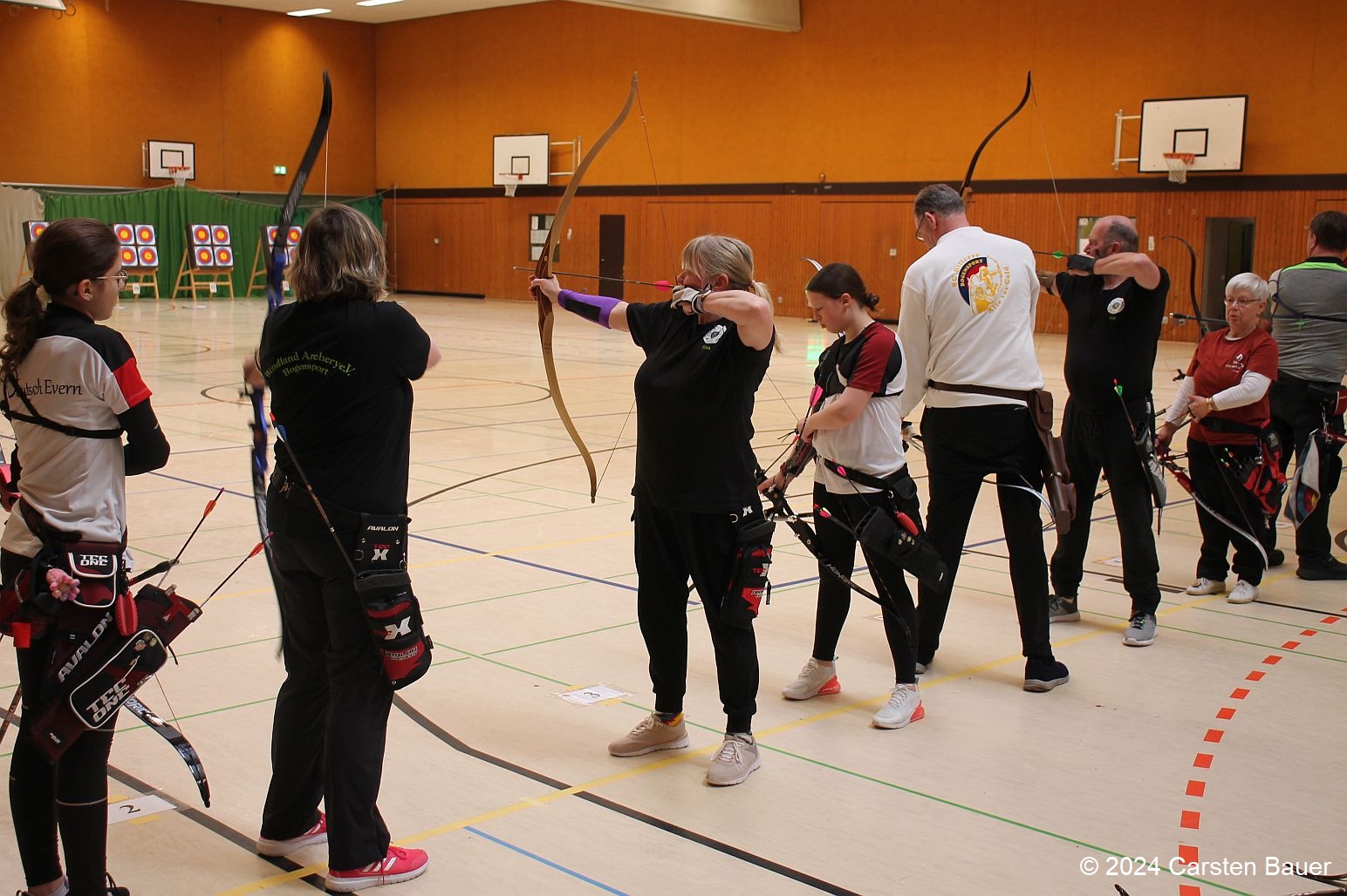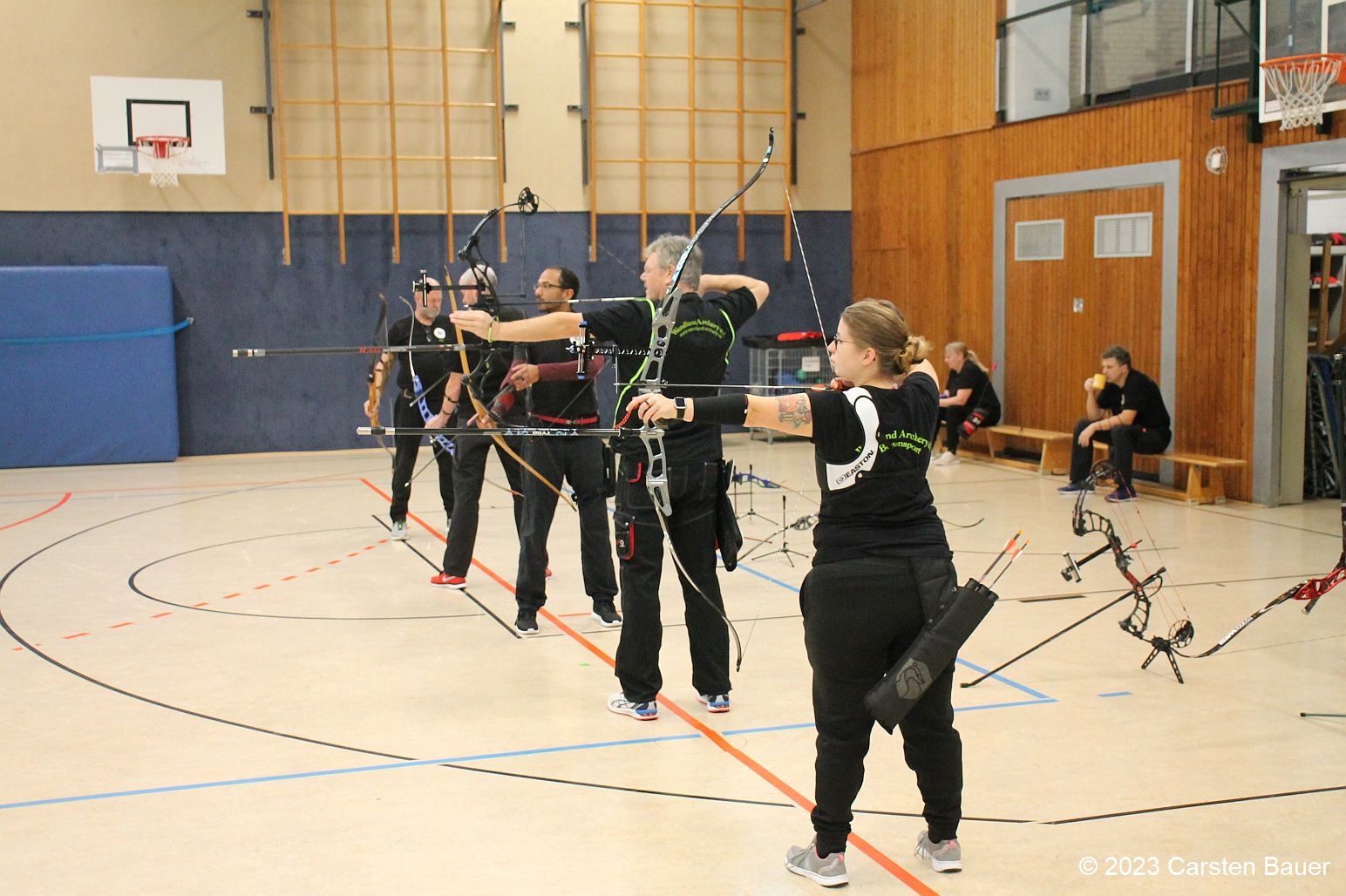 Zum Abschluss der Hallensaison noch mal 2 x 36 Pfeile auf 30 Meter schießen, in der Halle, ohne Wind und Wetter. Ja, das wollten wir. Also fuhren 10 Bogenschützinnen und -schützen aus unserem Verein am Sonntag, 17.03.2024, frühmorgens nach Celle. Im Gepäck hatten wir nicht nur unsere Bogenausrüstungen, sondern auch viel gute Laune.