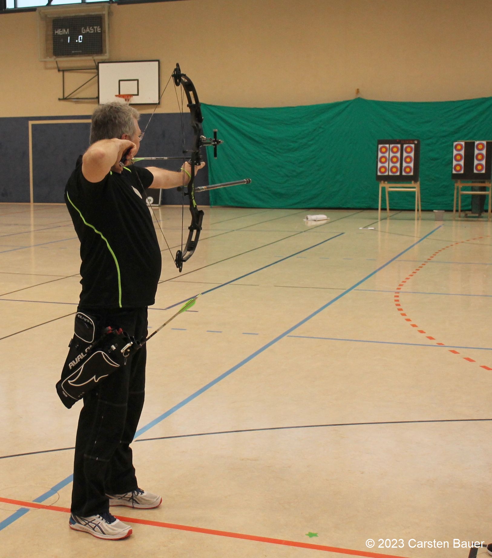 Michael bewies mit zwei gleichmäßig gut geschossenen Durchgängen (686 Ringe gesamt) und Platz 3 von 4 Schützen, dass er seinen Compoundbogen beherrscht.