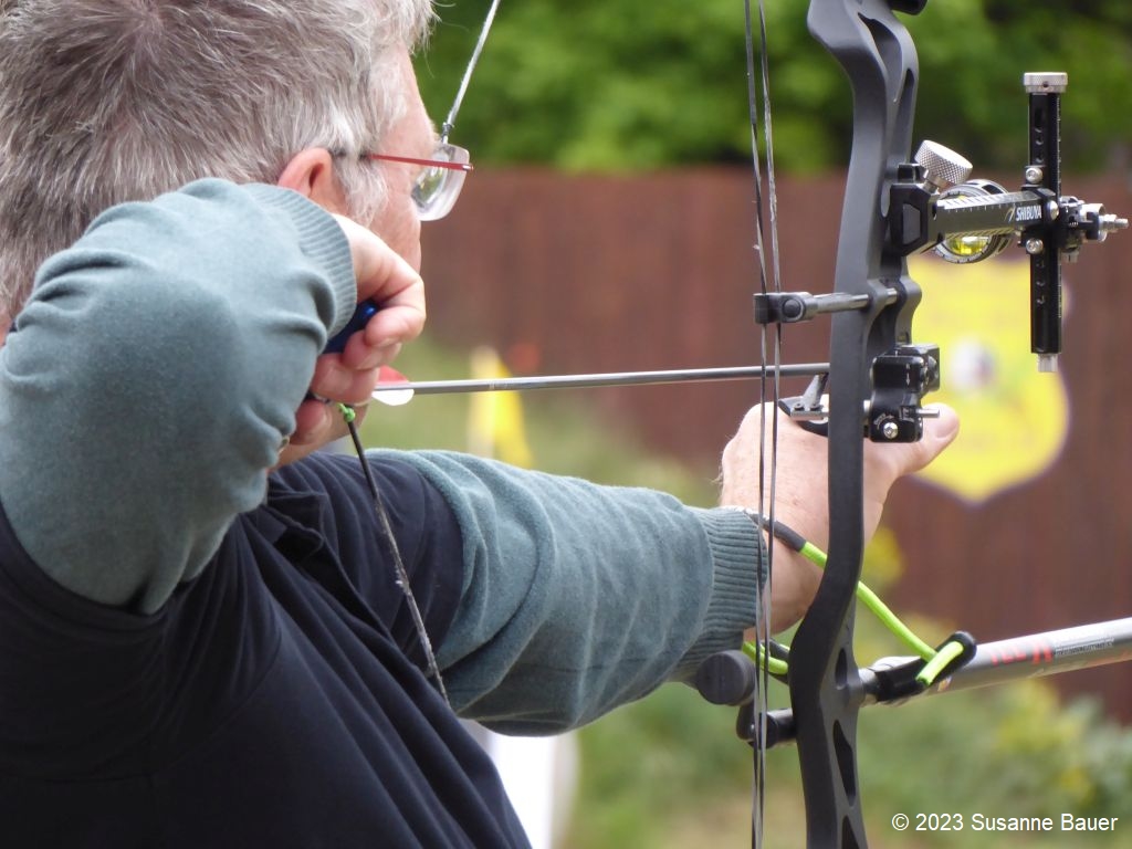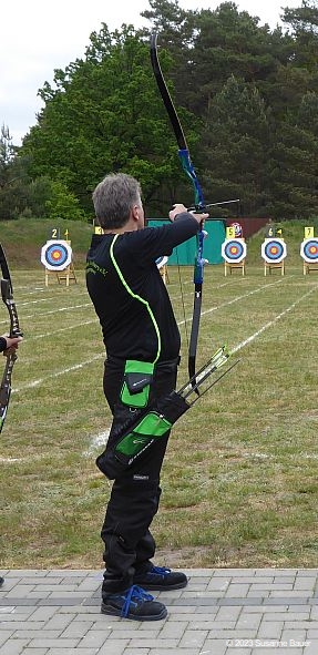 Carsten traf in der Klasse Recurve Master auf 4 weitere Schützen. Nach dem Einschießen startete er mit guten Wertungspassen. Doch dann verrutschten die Nockpunkte auf seiner Sehne. Das kannte er schon vom Training zu Hause. Das Resultat zeigte sich sofort auf der Scheibe. Aber man reist nie ohne Werkzeugkoffer zu anderen Turnieren. Von Ersatzpfeilauflage bis hin zur Nockpunktzange ist immer alles dabei. In diesem Fall half zwischen zwei Passen ganz einfach Sekundenkleber