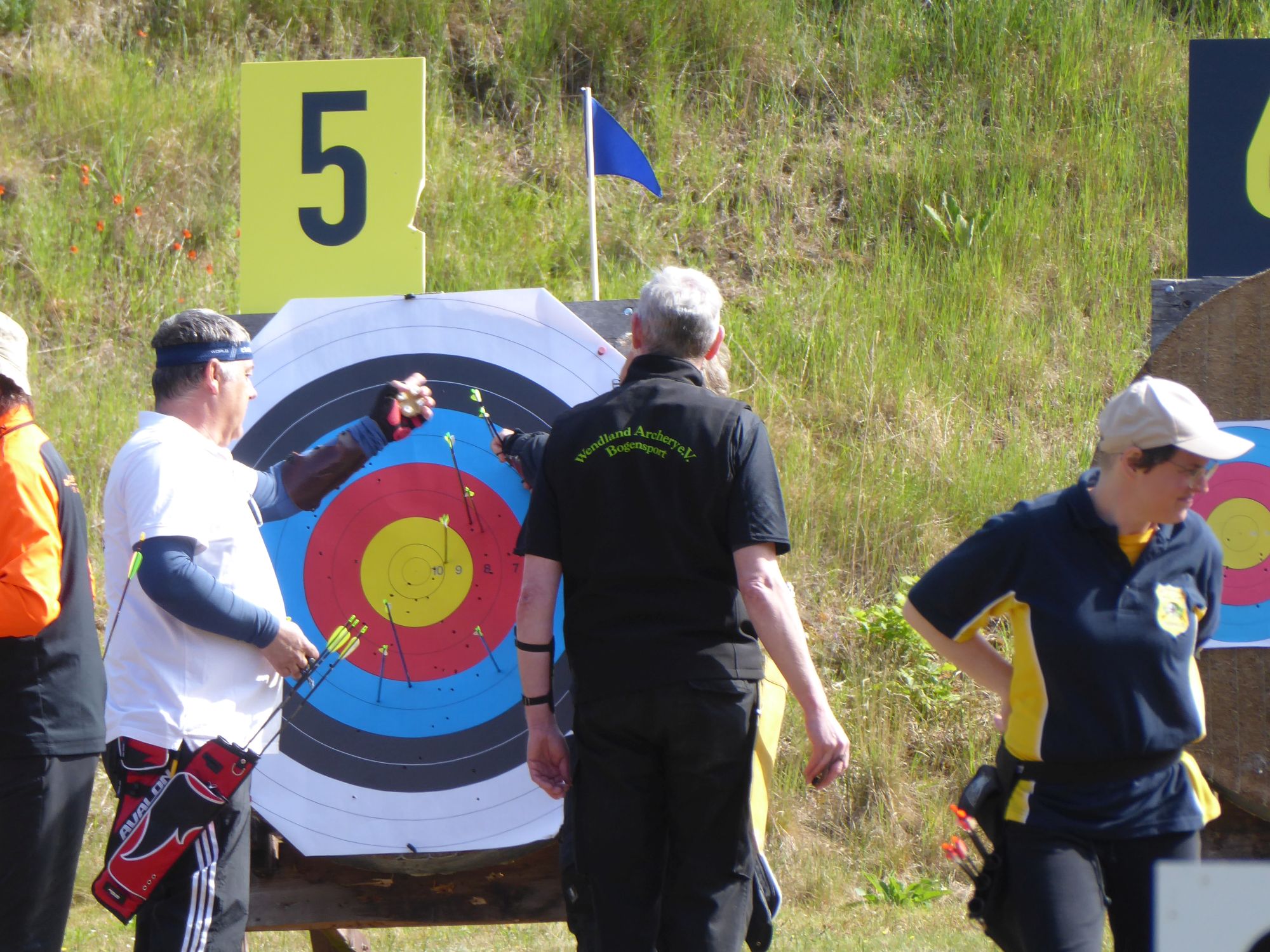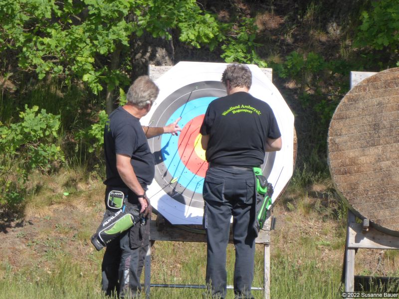 Schon bei den Probepfeilen zeigte sich, dass das Schießen keine einfache Sache werden würde. In diesem Sommer blieb es noch bei 4 Minuten Zeit für 6 Pfeile. Da kann man schon mal eine Windböe abwarten. Aber auf eine Entfernung von 50 bzw. 60 Metern ist es eine Herausforderung, den Bogenarm ruhig zu halten und dann auch noch ins Gold zu treffen.
